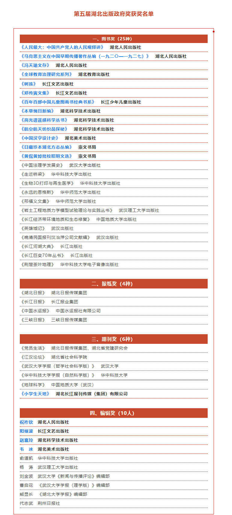 第五屆湖北出版政府獎獲獎名單揭曉,長江傳媒14種出版物入選