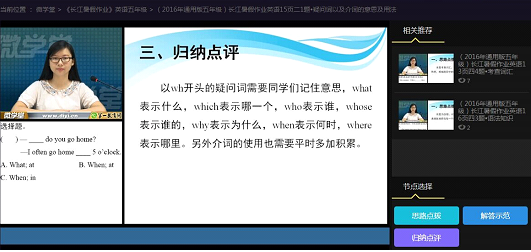 多多微學堂最大的特點在于它解決了家長和教師擔心的學生直接抄答案的問題。微學堂中的視頻采用的是分步引導式的講解方法,由“思路點撥、解答示范、歸納點評”三大模塊構成。“思路點撥”向學生們講解題目所包含的知識點,并舉例說明此類型的題應如何下手;“解答示范”是向學生一步一步展示該道題的解題過程,且不給出答案,讓學生自己按照方法解題;“歸納點評”是總結此類型題目的解題要點和答題技巧,讓學生能夠做到觸類旁通,舉一反三。這樣的講解方式更符合學生的學習習慣和認知規律,能讓學生在看完視頻之后,真正了解解題的方法和技巧。同時每一個學習視頻都附帶了兩個相關視頻,幫助學生鞏固相關知識點。