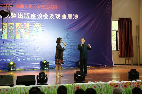 在戲曲展演中彭青蓮、李春華、湖北省黃梅戲劇院以及黃岡市實(shí)驗(yàn)小學(xué)學(xué)生演唱了《葛麻》《原野情仇》等經(jīng)典曲目。會(huì)上,湖北教育出版社向黃岡市教育系統(tǒng)贈(zèng)送了《戲曲進(jìn)校園》。