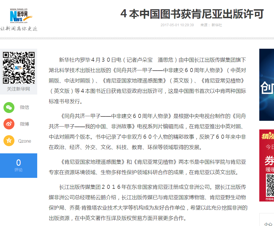 據新華社內羅畢4月30日電 (記者盧朵寶、潘思危)由中國長江出版傳媒集團旗下湖北科學技術出版社出版的《同舟共濟一甲子——中非建交60周年人物錄》(中英對照版、中法對照版)、《肯尼亞國家地理遙感圖集》(英文版)、《肯尼亞常見植物》(英文版)等4本圖書近日獲肯尼亞政府出版許可,這是中國圖書首次以中肯兩種國際標準書號發行。