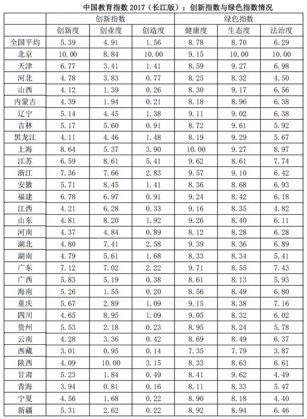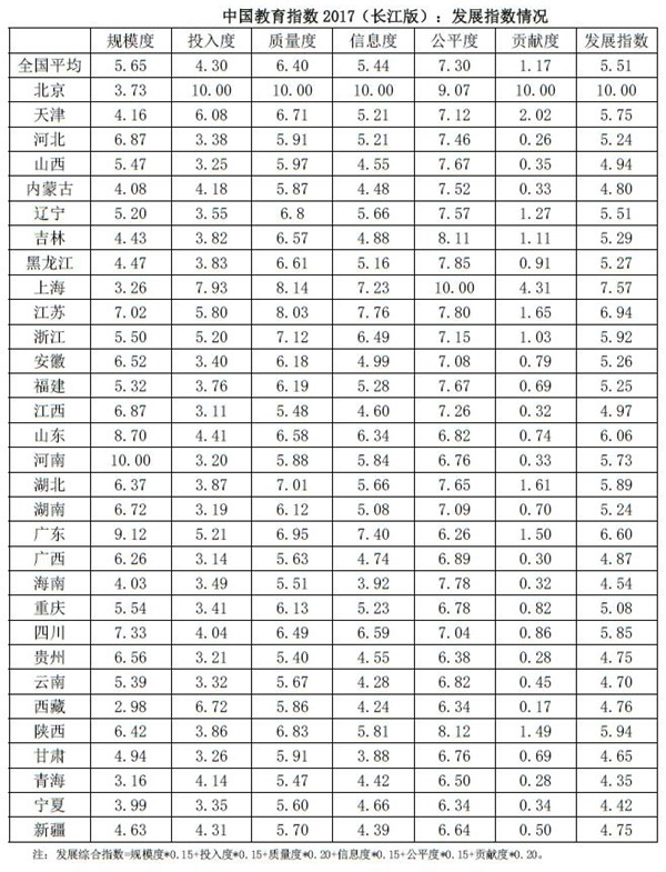 人民網北京3月3日電(孫競)在今天上午舉辦的第十一屆北京長江教育論壇上,長江教育研究院正式發布《中國教育指數2017》。該研究報告從規模、投入、質量、信息、公平、貢獻、創新、創業、創造、健康、生態、法治等12個維度反映了2017年全國及各省(自治區、直轄市)教育治理能力、改進效果以及發展水平。