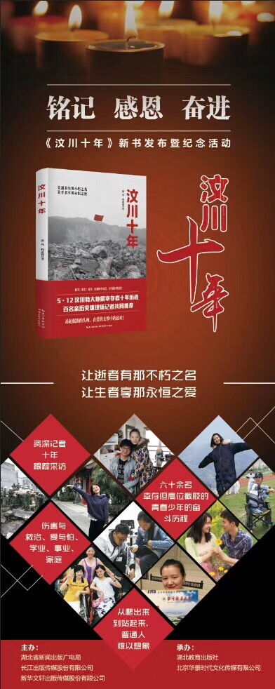 5·12汶川特大地震十周年紀念日來臨,全體嘉賓和活動參與者在活動現場集體默哀一分鐘,沉痛哀悼遇難同胞。《汶川十年》的兩位作者,志愿者代表“王干媽”王志航,汶川地震北川中學幸存教師代表廖光明、學生代表晏鵬、王虎、鄭海陽和楊鳳,援建單位代表天津市榮程普濟基金會理事長賈煒等相繼發言。新書中的主人公之一陳程為大家演唱由他自己作詞作曲的歌曲《你的名字比我生命更重要》。新華文軒出版傳媒股份有限公司嘉賓和北川羌族自治縣政府領導、本書作者、湖北教育出版社社長等向北川中學代表捐贈圖書。