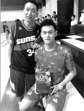 中國奧運冠軍孫楊(右)與《科比·布萊恩特全傳》作者段冉(左)合影。 湖北科技社 供圖