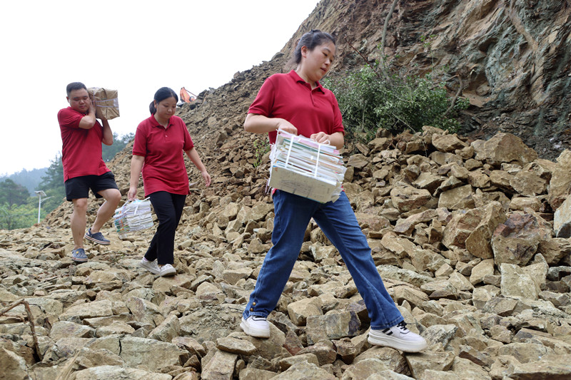 ▲ 8月25日,湖北新華十堰市分公司教育服務(wù)團(tuán)隊(duì)茅箭片區(qū)組長(zhǎng)方芳(右一)和同事們跨越滑坡路段,為茅塔鄉(xiāng)大坪村大坪小學(xué)的師生們送去教材。