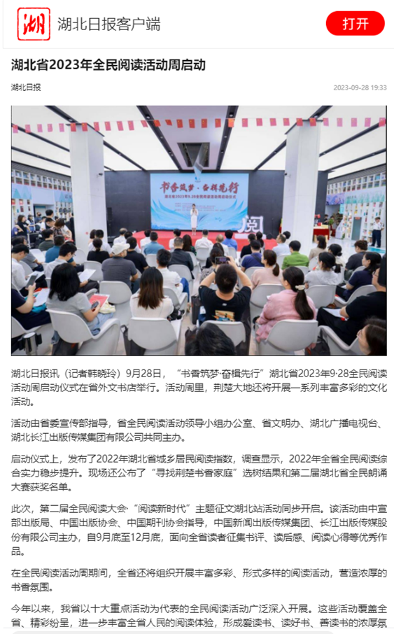此次,第二屆全民閱讀大會·“閱讀新時代”主題征文湖北站活動同步開啟。該活動由中宣部出版局、中國出版協會、中國期刊協會指導,中國新聞出版傳媒集團、長江出版傳媒股份有限公司主辦,自9月底至12月底,面向全省讀者征集書評、讀后感、閱讀心得等優秀作品。