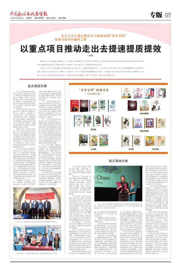 中國新聞出版廣電報|長江少年兒童出版社大力推進實施“百年百部”經典書系對外翻譯工程——以重點項目推動走出去提速提質提效
