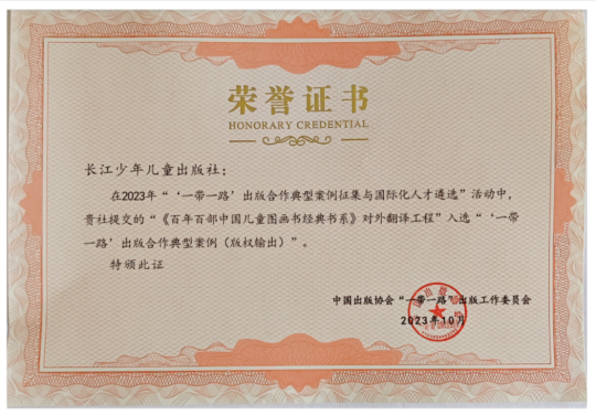 “百年百部”經典書系對外翻譯工程入選中宣部、商務部等五部委聯合頒發的2023—2024年度國家文化出口重點項目,《百年百部中國兒童文學經典書系》對外翻譯工程入選2021年中國出版協會“一帶一路”出版合作典型案例,《百年百部中國兒童圖畫書經典書系》對外翻譯工程入選2023年“一帶一路”出版合作典型案例(版權輸出),兩套書系中的多本圖書入選國家級翻譯資助項目和獎項。