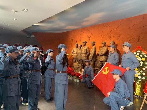 在新四軍第五師歷史陳列館入口的大型浮雕群英圖前,換好紅軍服的黨員同志面向黨旗,舉起右拳,重溫入黨誓詞。宣誓儀式結束后,大家合唱了經典紅色曲目《沒有共產黨就沒有新中國》。